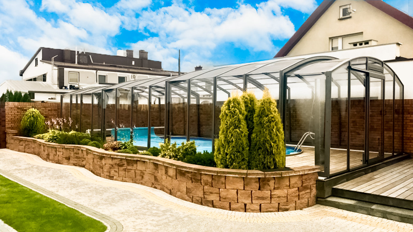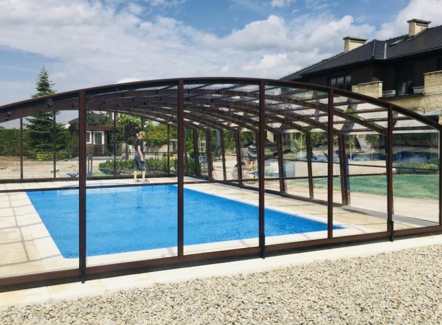 An kälteren Tagen schafft diese hohe Poolüberdachung einen idealen Ort zum Entspannen und Spielen am Beckenrand, der trotz der geschlossenen Segmente viel Freiheit und Komfort bietet. Das montierte Rollsystem ermöglicht ein leichtes Verschieben aller Segmente und durch die zusätzliche Verlängerung der Führungen lässt sich das Dach komplett von der Beckenoberfläche schieben.
