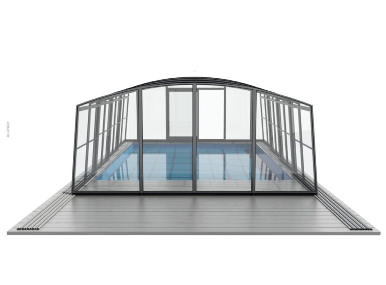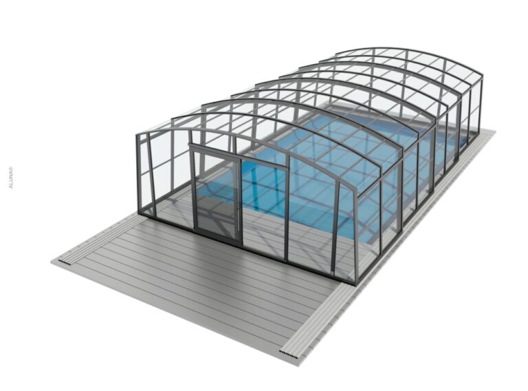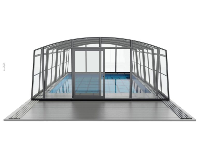Die Aluna® Admiral Poolüberdachung besticht durch ihre hohen, senkrechten Seitenwände und das dezente, leicht gewölbte Dach. Diese Bauweise bietet nicht nur optimalen Schutz, sondern auch viel Platz für die komfortable Nutzung des Pools. Das beidseitige Schienensystem sorgt für eine flexible und einfache Handhabung, sodass die Überdachung mühelos verschoben werden kann.