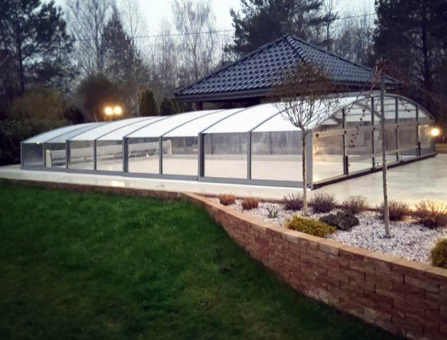 Es ist eine halbhohe Poolüberdachung mit den höchsten Festigkeitsparametern. Die fast vertikalen Seitenwände der Struktur bieten unbegrenzte Möglichkeiten, den Strand zu gestalten, und ermöglichen gleichzeitig einen außergewöhnlichen Komfort beim Schwimmen und Verweilen im Wasser. Darüber hinaus beseitigt die Überdachung dank ihrer gewölbten Struktur im oberen Teil Probleme mit Schnee und leitet Regenwasser perfekt ab.