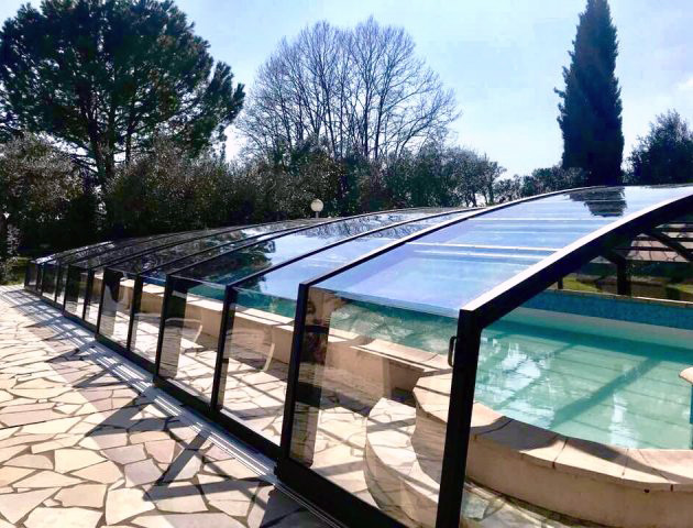 Der Vorteil dieses Modells ist auch die Tatsache, dass es eine einzige massive Polycarbonatplatte vom Typ „Sicherheitsglas“ verwendet, warmgeformt, die das Dach optisch entlastet, und sein leichter und moderner Körper gibt einen erstaunlichen visuellen Effekt im Raum. Überdachung für den Pool mit einer außergewöhnlich starken und langlebigen Struktur.