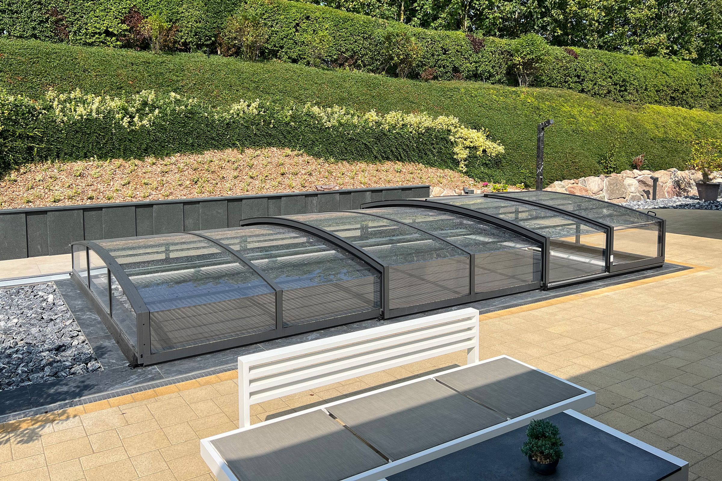 Diese spezielle Konstruktion ermöglicht eine besonders einfache und platzsparende Bedienung, da die Überdachung nur auf einer Seite geführt wird. Sie fügt sich stilvoll in jede Gartenlandschaft ein und bietet gleichzeitig den zuverlässigen Schutz, den Ihr Pool benötigt.