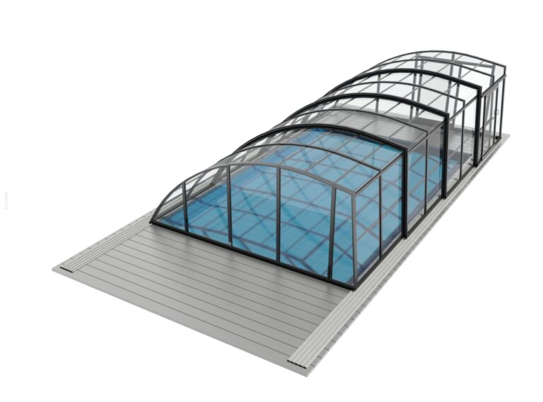 Die Aluna® Delta II Schwimmbadüberdachung besticht durch ihr innovatives Design: Auf einer Seite bietet die hohe, senkrechte Seitenwand großzügigen Raum und Komfort, während die andere Seite durch das bogenförmige Dach sanft bis zum Boden reicht. Diese Form bietet nicht nur eine moderne und futuristische Optik, sondern auch optimalen Schutz und maximale Funktionalität.