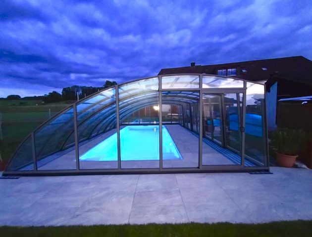 Diese hohe Poolüberdachung überzeugt mit besonderer Stabilität – selbst bei starkem Wind. Die gewölbte Seitenstruktur leitet Regen und Schnee zuverlässig ab. Eine praktische Eingangstür in der Giebelwand ermöglicht bequemen Zugang zum Pool. Zusätzlich kann das Pooldach mit seitlichen Schiebetüren ausgestattet werden, die den Einstieg von beiden Seiten ermöglichen.