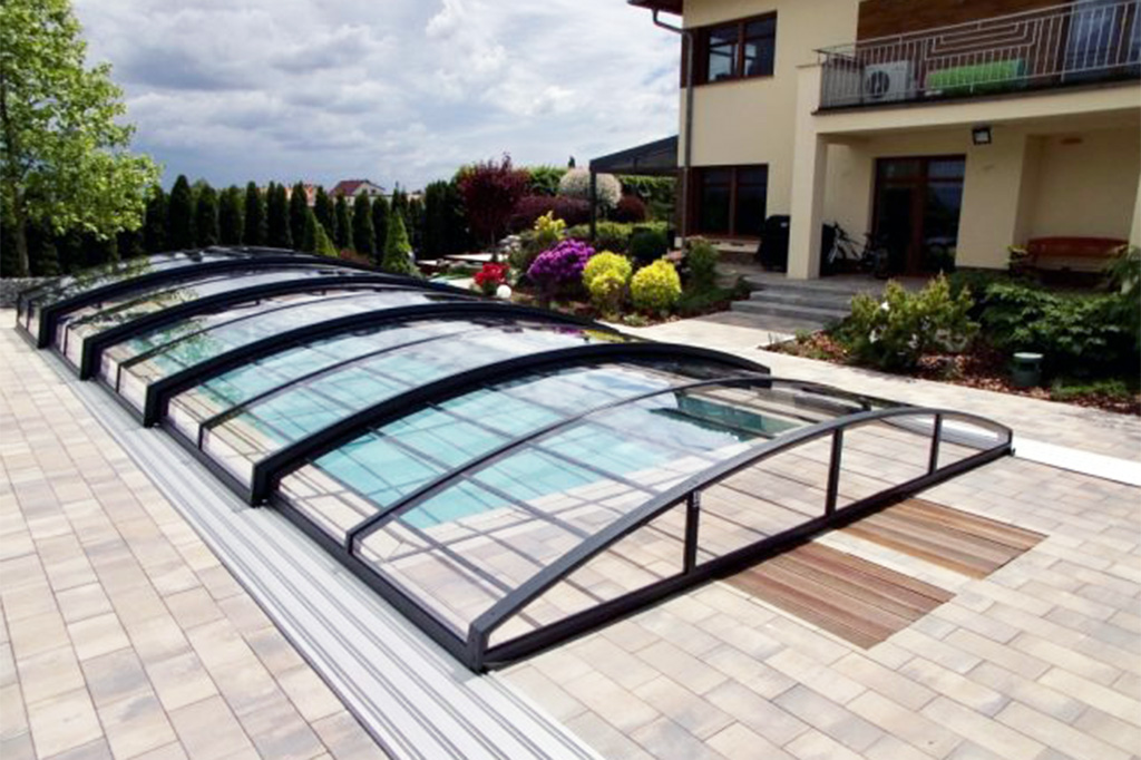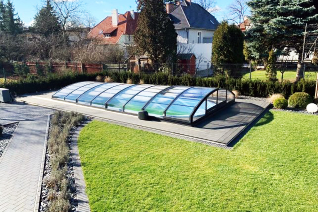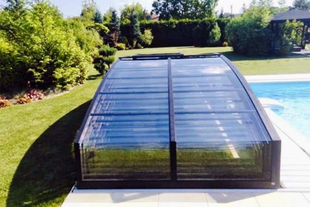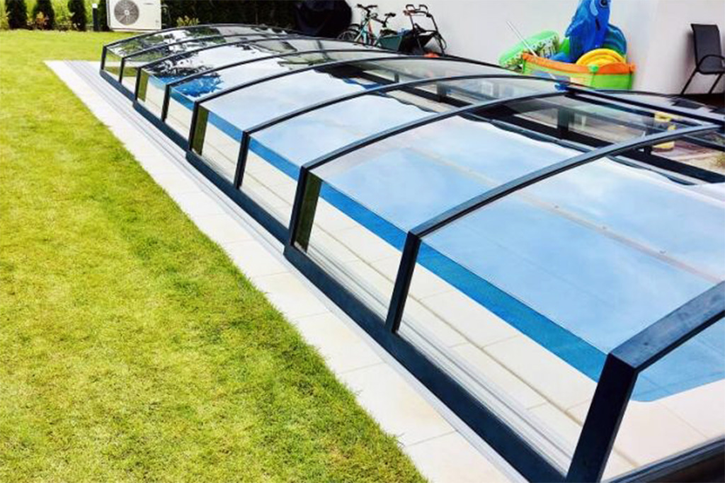 Das leichte, moderne Design des Pooldachs verleiht Ihrem Pool einen attraktiven und einzigartigen Charakter. Charakteristisch für dieses Modell sind neben der gewölbten Form des Dachoberteils die geraden Seitenwände.