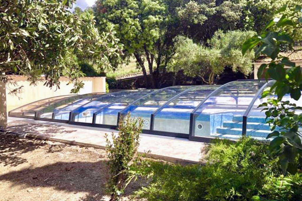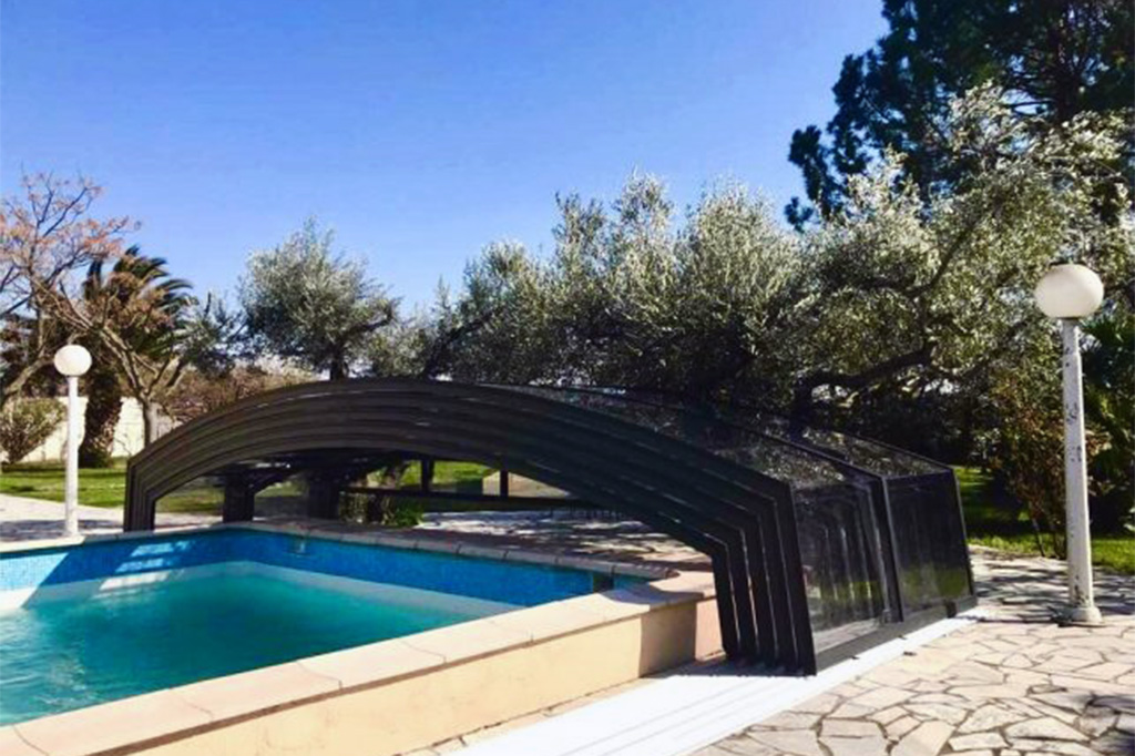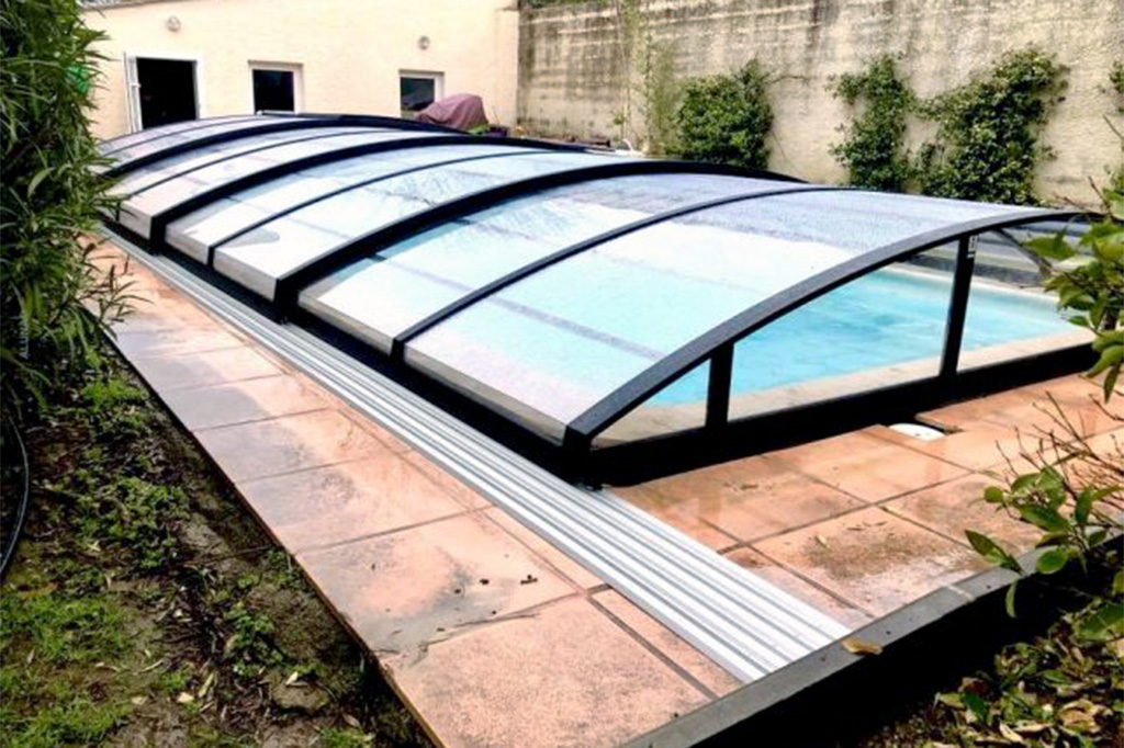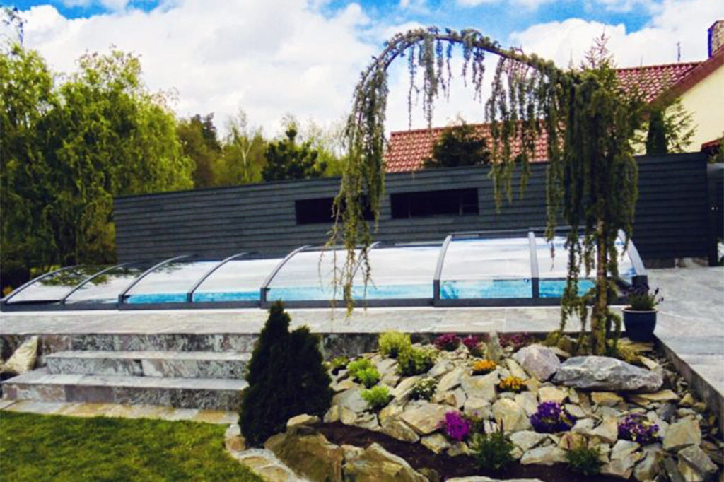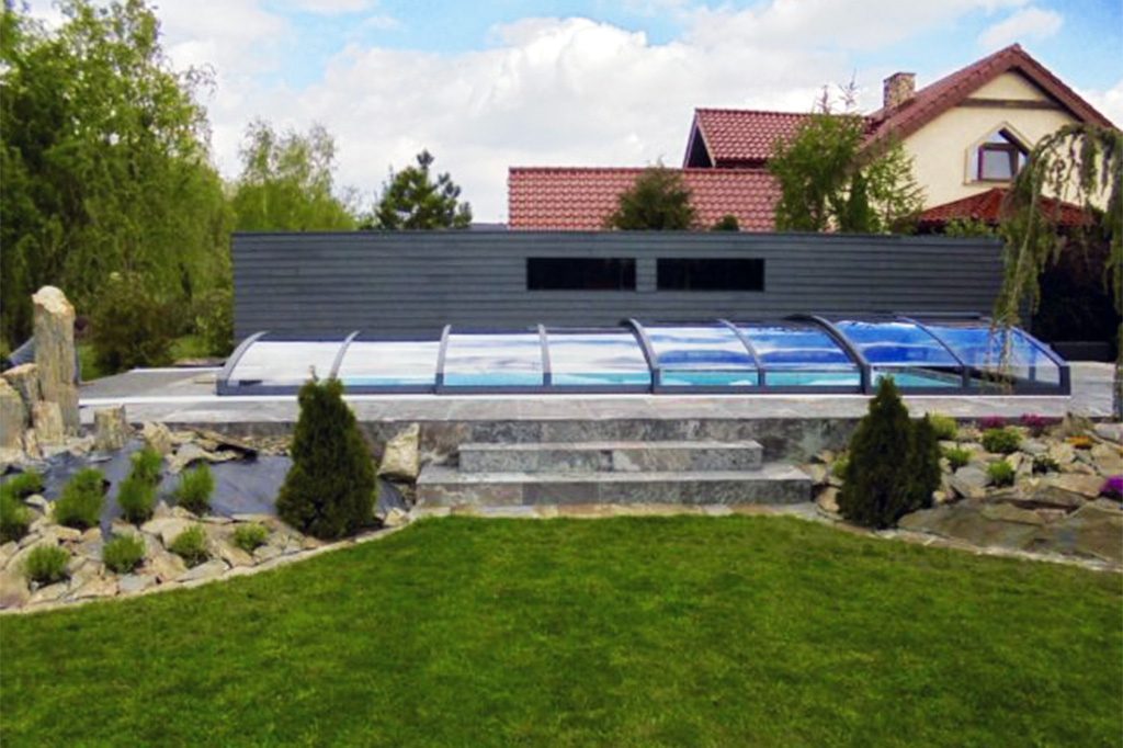 Das leichte, moderne Design des Pooldachs verleiht Ihrem Pool einen attraktiven und einzigartigen Charakter. Charakteristisch für dieses Modell sind neben der gewölbten Form des Dachoberteils die geraden Seitenwände.